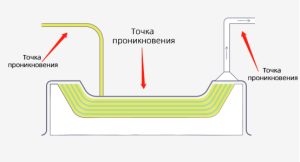 Утечки в вакуумной системе являются наиболее распространенным дефектом процесса при изготовлении композитных материалов методом вакуумной инфузии. Типы проникновения, классифицированные по местоположению, включают утечки в линии подачи смолы, утечки в вакуумном мешке и утечки в источнике вакуума (линии отвода смолы), как показано ниже.